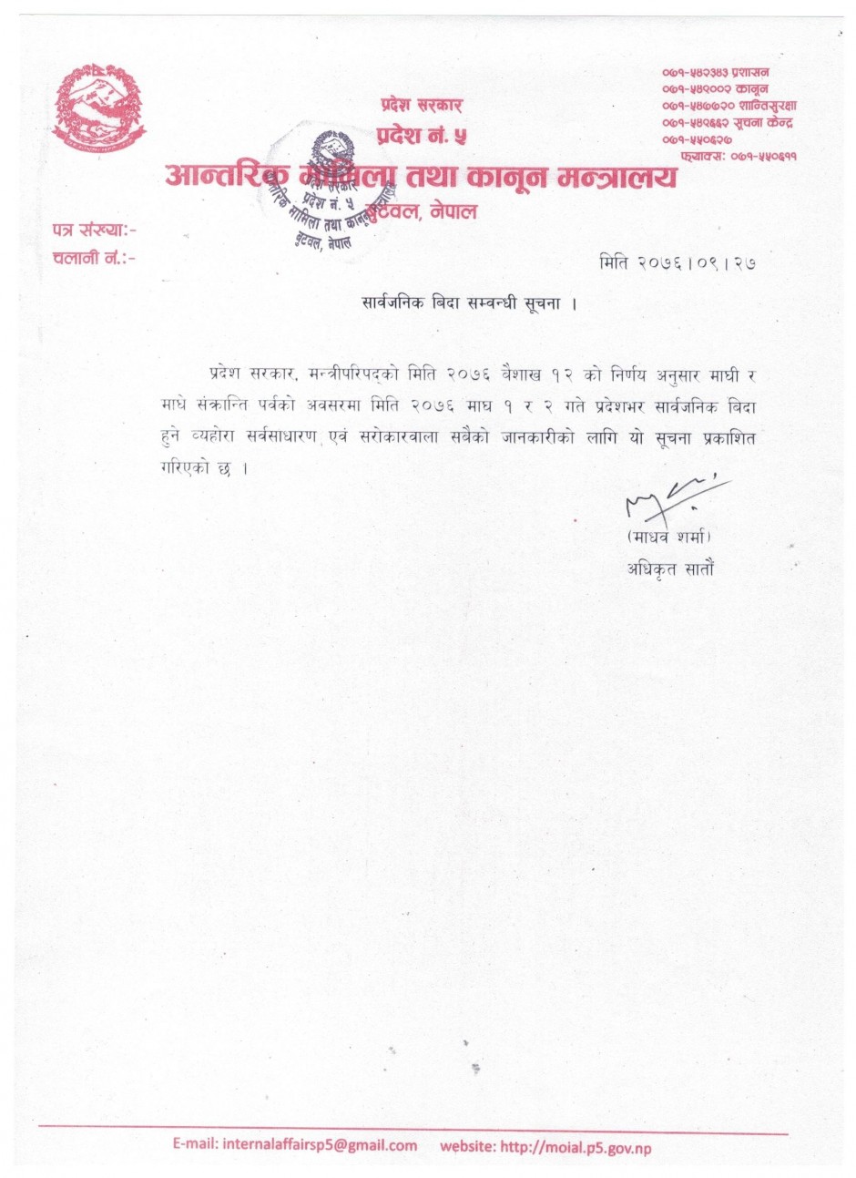 मकर संक्रान्तिको प्रदेशभर सार्वजनिक विदा सम्बन्धमा ।