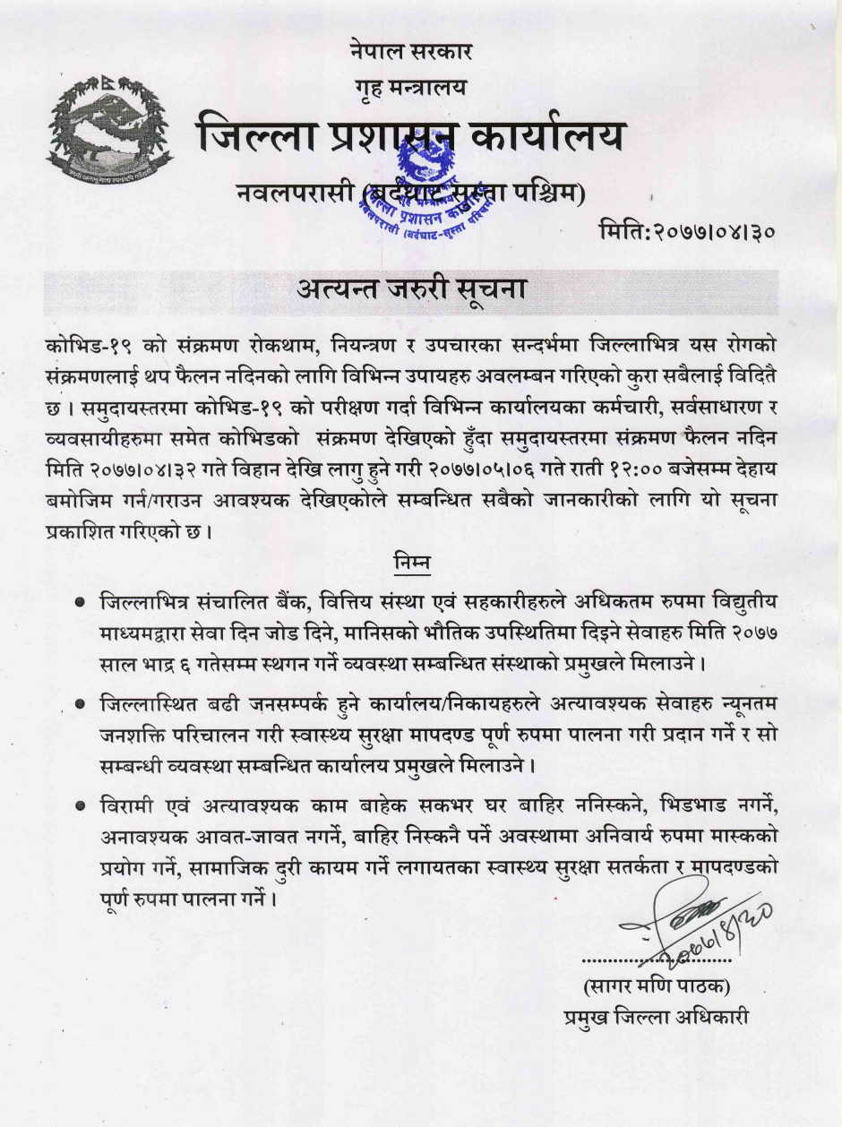 © सर्वाधिकार सुरक्षित जिल्ला प्रशासन कार्यालय, नवलपरासी (बर्दघाट सुस्ता पश्चिम)