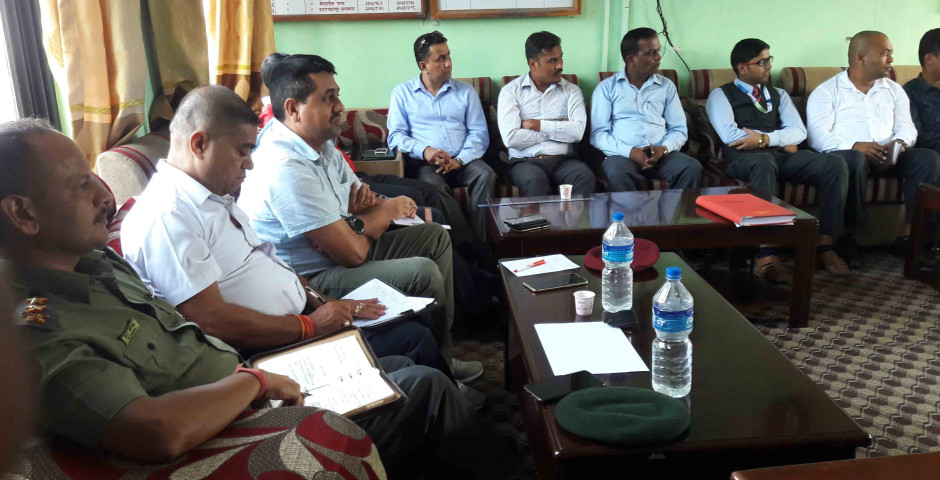 आज मिति २०७६ असोज ०७ गते प्रमुख जिल्ला अधिकारी श्री शम्भु प्रसाद मरासिनीको अध्यक्षतामा जिल्ला प्रशासन कार्यालय नवलपरासी (बसुप)मा सुरक्षा निकायका प्रमुख, उद्योग वाणिज्य संघका अध्यक्ष, जिल्लास्थित बैंक तथा वित्तिय संस्थाका प्रमुख एवं प्रतिनिधिहरु तथा सुनचाँदी व्यवसायी संघका अध्यक्ष लगायतको उपस्थितिमा आसन्न दशै, तिहार र छठ जस्ता चाडपर्वहरुमा सुरक्षा व्यवस्था एवं सेवा प्रवाह सम्बन्धमा छलफल भै उक्त समयमा बैंक तथा वित्तिय संस्थाहरुमा सेवाग्राहीहरुको बढी चाप हुने भएकोले सबै बैंक तथा वित्तिय संस्थाहरुले सहज र सरल कार्य वातावरण निर्माण गरी गर्ने साथै बैंक एवं वित्तिय संस्थाहरुको आन्तरिक सुरक्षा व्यवस्थालाई संस्थाहरुले थप मजबुत बनाउने र बाह्य सुरक्षाको भरपर्दो र विश्वसनीय व्यवस्था जिल्ला प्रहरी कार्यालय र सशस्त्र प्रहरी बल नेपाल, नं.२६ गण हे.क्वा.ले मिलाउने लगायतका निर्णय भएको छ ।