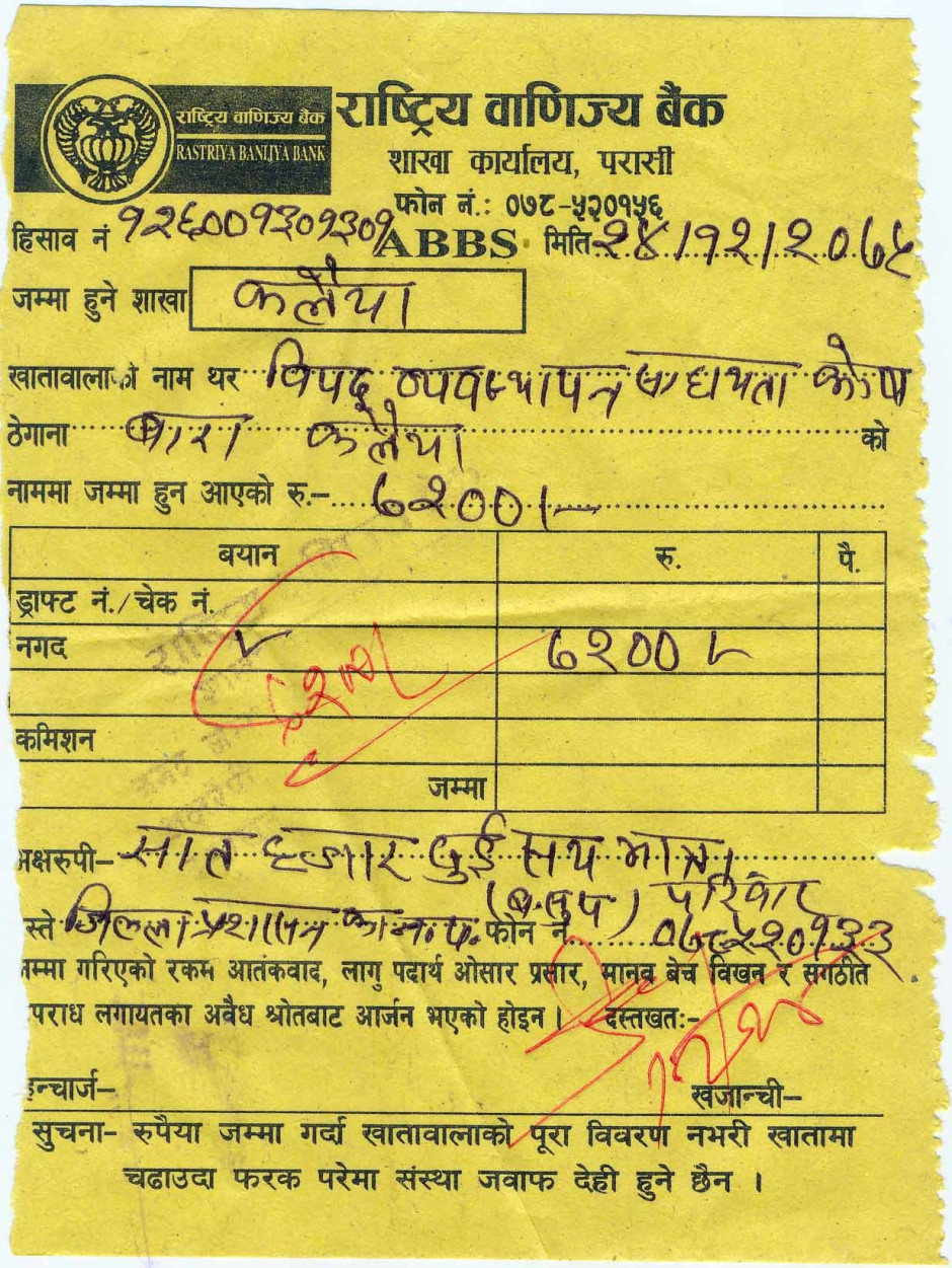 मिति २०७५।१२।१७ गते बारा जिल्लामा आएको हावाहुरीले ठुलो मात्रा जनधनको क्षति पुर्याएकोले उक्त पीडितहरुलाई राहतकाे लागि यस जिल्ला प्रशासन कार्यालय नवलपरासी बसुपका प्रमुख जिल्ला अधिकारी श्री देवेन्द्र लामिछाने ज्यु लगायत कार्यालय अन्य कर्मचारीहरुले स्वेच्छाले जम्मा गरेको रकम विपद् व्यवस्थापन सहायता कोषको खाता नं. १२६००१३०१३०१ (रा.व.बैंक कलैया) मा आज मिति २०७५।१२।२४ गते रु.७२००। जम्मा गरियो ।