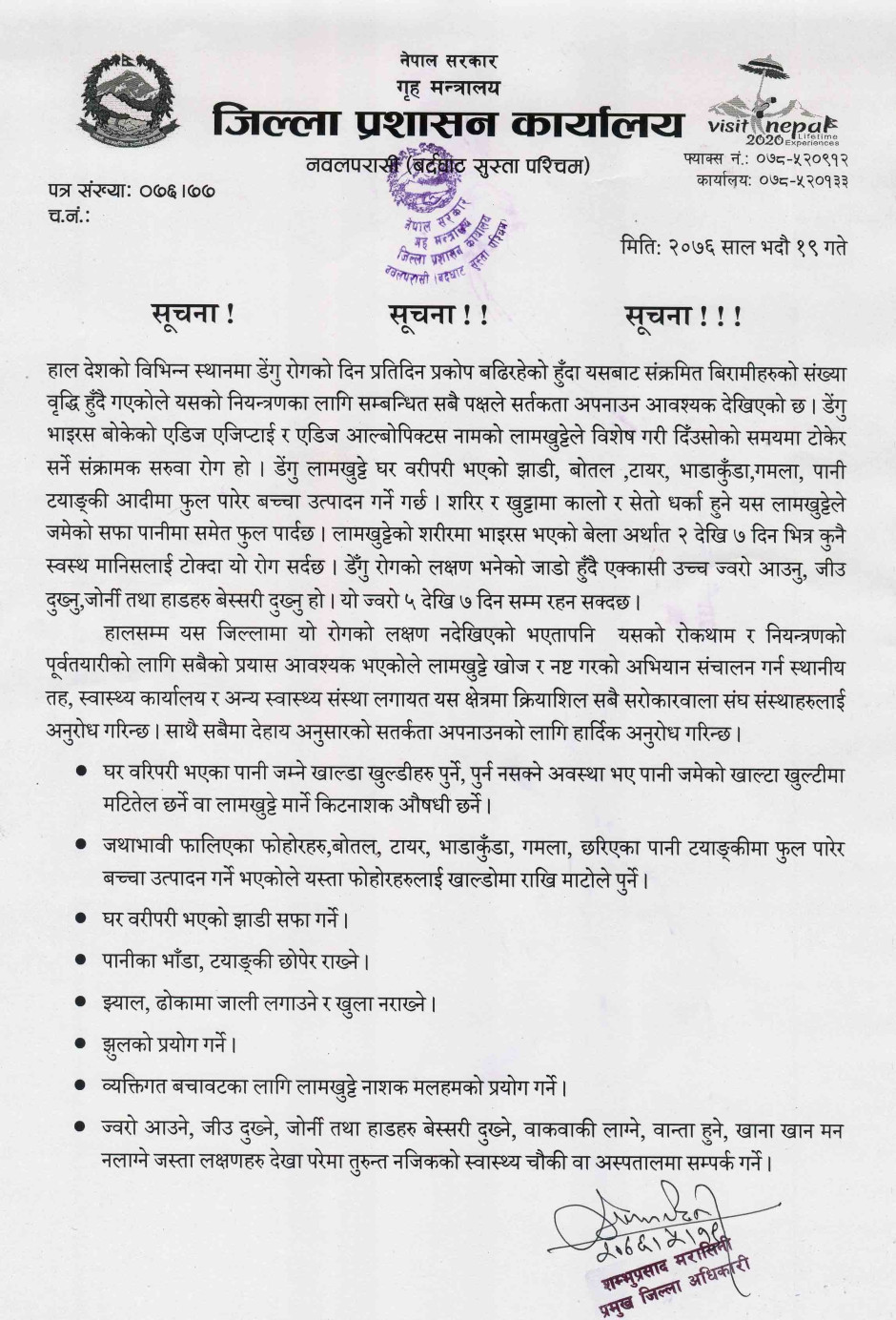 डेंगु रोगको प्रकोपबाट बच्ने सम्बन्धी सूचना