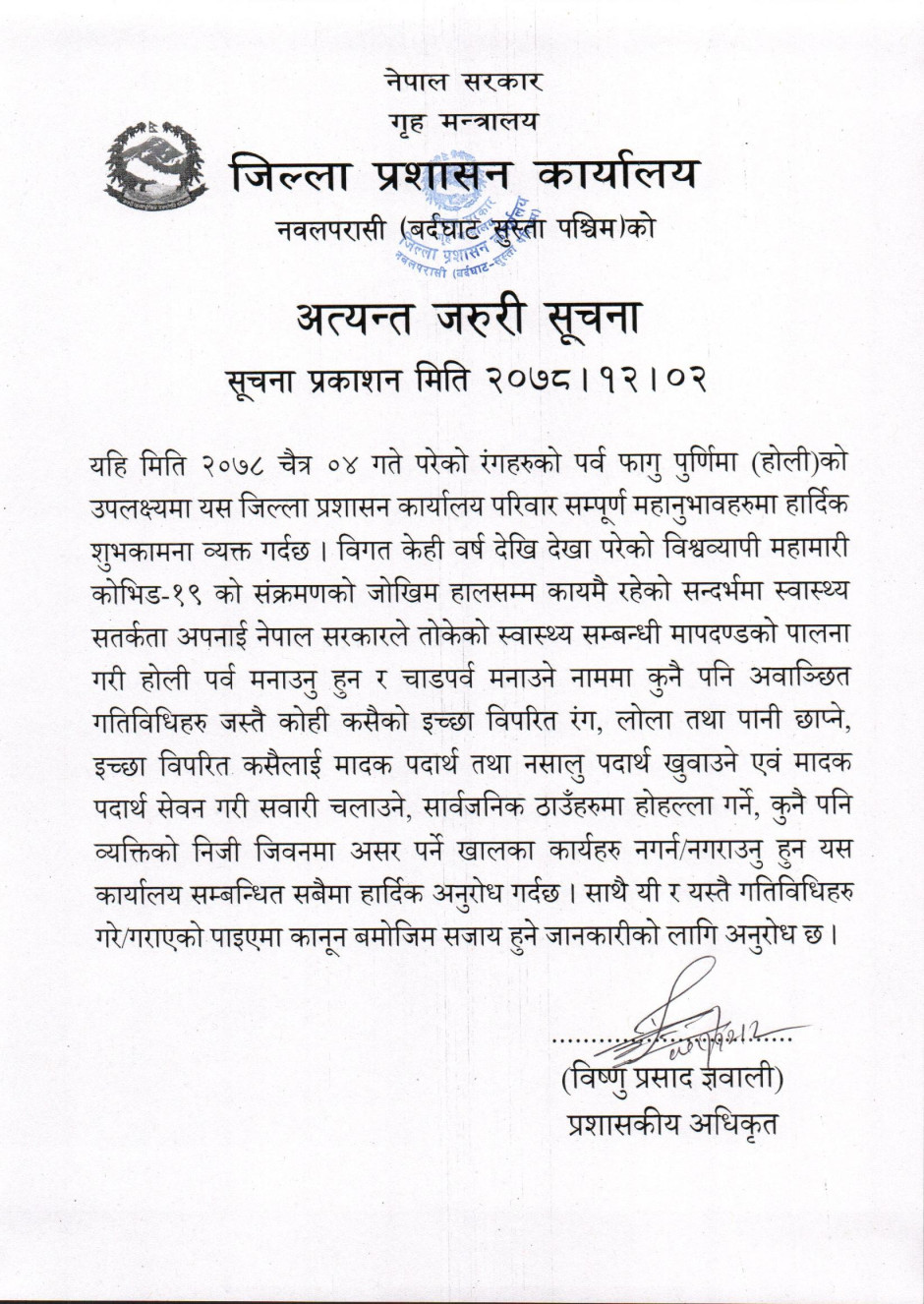 तस्बिर : फागु पुर्णिमा (होली)को अवसरमा जिल्ला प्रशासन कार्यालयबाट जारी भएको अत्यन्त जरुरी सूचना