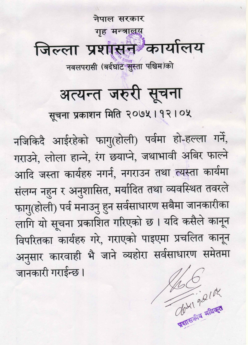 होली पर्व मर्यादापूर्वक मनाउने सम्बन्धी सूचना