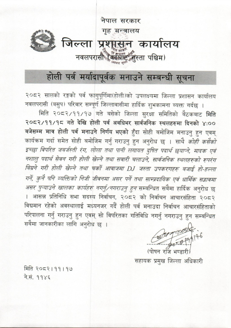 तस्बिर : होली पर्व मर्यादापूर्वक मनाउने सम्बन्धी सूचना