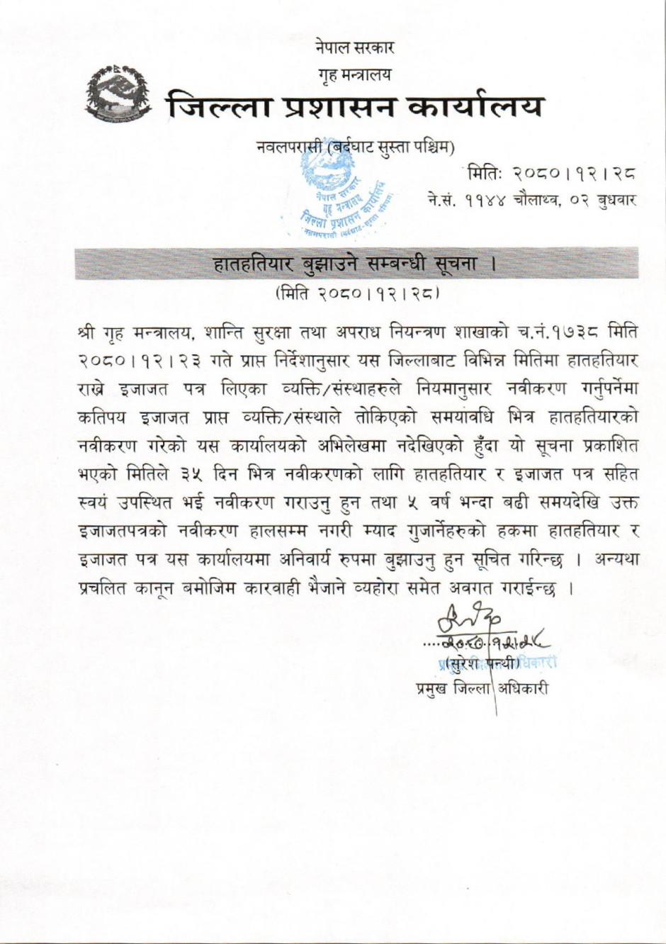 तस्बिर : हातहतियार बुझाउने सम्बन्धी सूचना ।