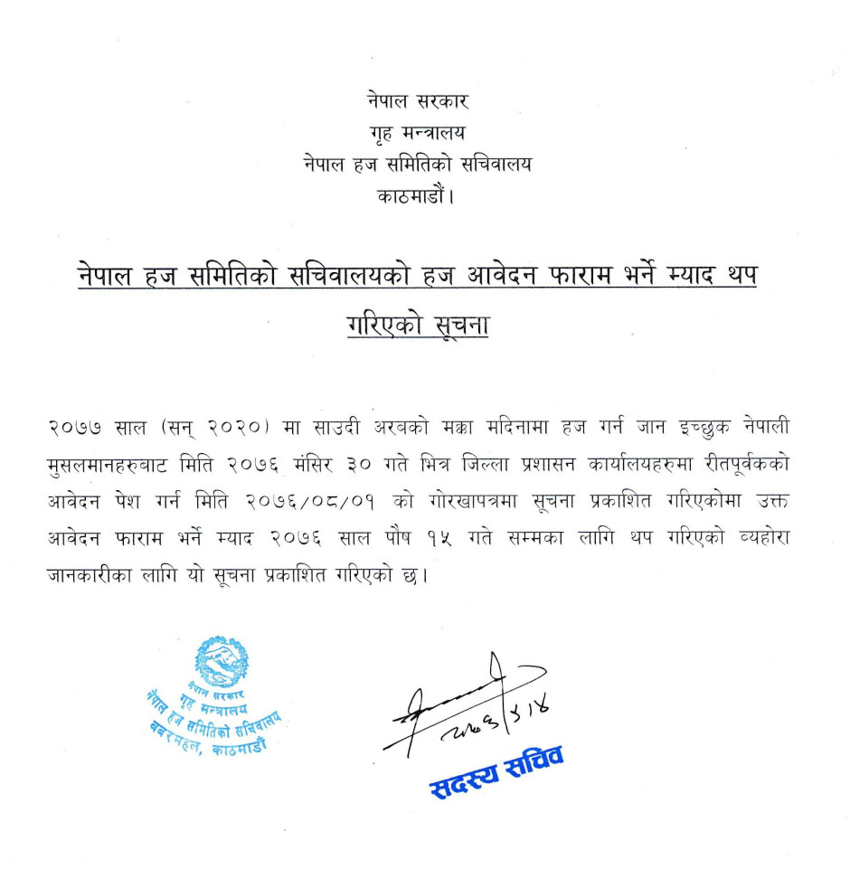 तस्बिर : हज आवेदन फाराम भर्ने म्याद थप गरिएको सूचना