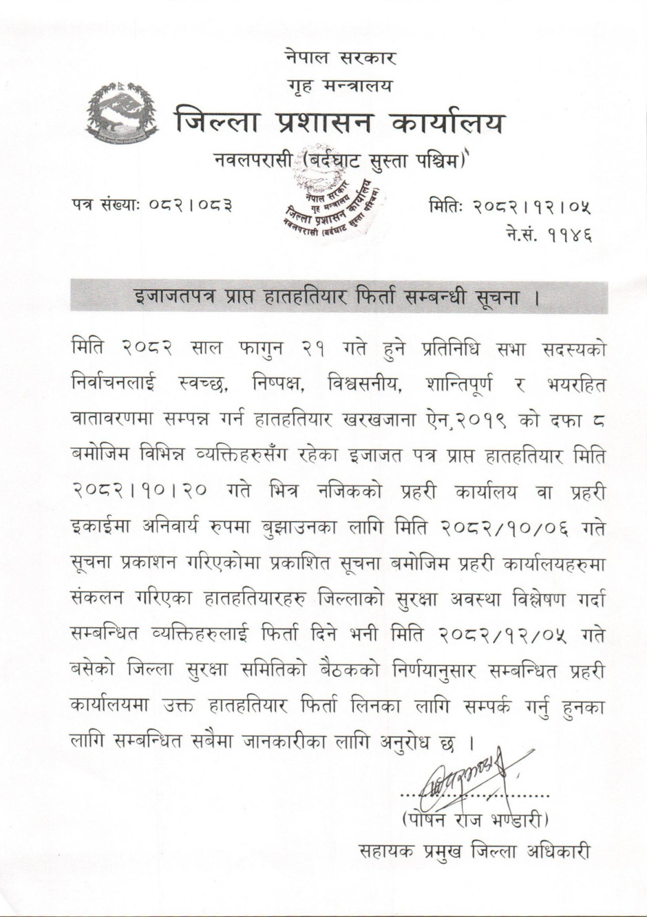 © सर्वाधिकार सुरक्षित जिल्ला प्रशासन कार्यालय, नवलपरासी (बर्दघाट सुस्ता पश्चिम) .