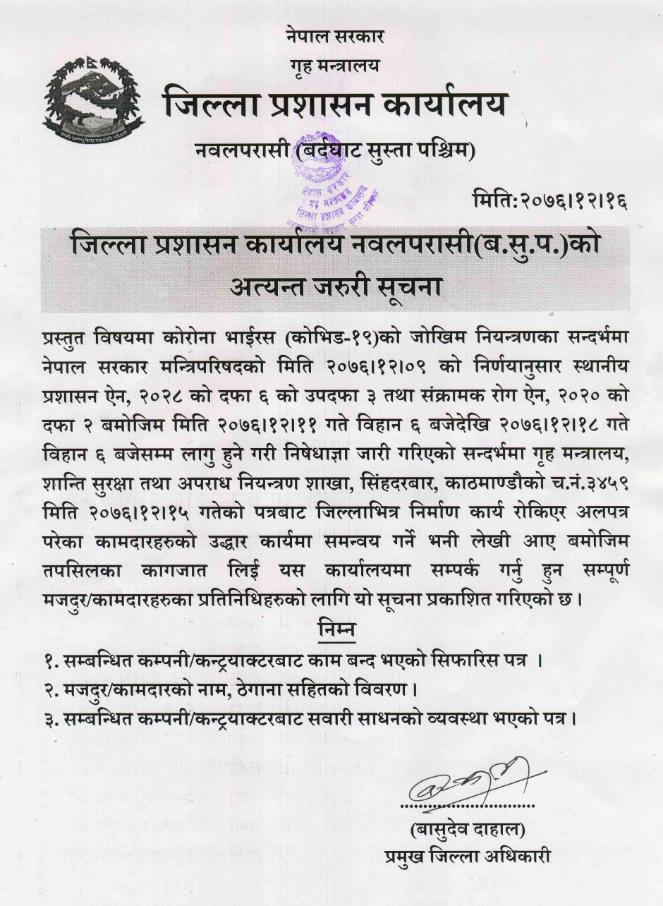 तस्बिर : जिल्ला प्रशासन कार्यालय नवलपरासी(ब.सु.प.)को अत्यन्त जरुरी सूचना