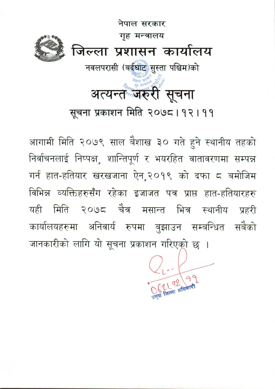 तस्बिर : जिल्ला प्रशासन कार्यालय, नवलपरासी (बर्दघाट सुस्ता पश्चिम)को हातहतियार बुझाउने सम्बन्धी अत्यन्त जरुरी सूचना