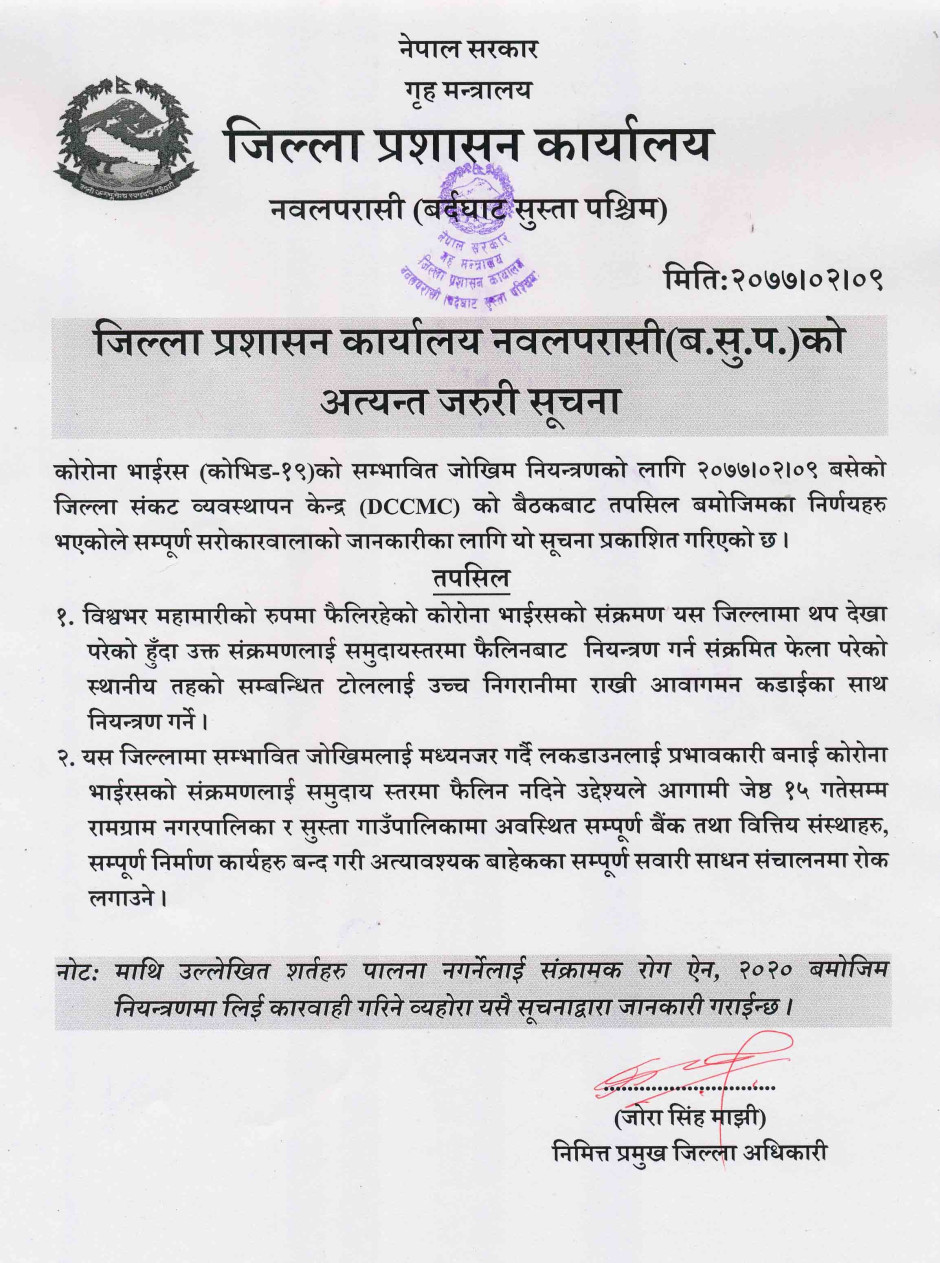 तस्बिर : जिल्ला प्रशासन कार्यालय नवलपरासी (बसुप) को अत्यन्त जरुरी सूचना