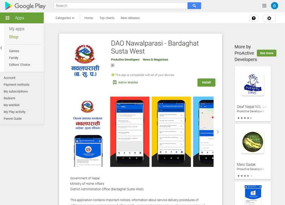 एप्लिकेशनलाई आफ्नो मोवाइलको गुगल प्ले स्टोरबाट Dao Nawalparasi Bardaghat Susta West लेखेर आ-आफ्नो एन्ड्रोइड मोवाइलमा डाउनलोड गरी प्रयोग गर्न सकिनेछ । यसमा जिल्ला प्रशासन कार्यालयले प्रदान गर्ने सेवा लगायत अन्य विविध विषयको सूचना लिन सकिने हुँदा सर्वसाधारण सबैमा प्रयोग गर्नु हुन समेत अनुरोध छ ।