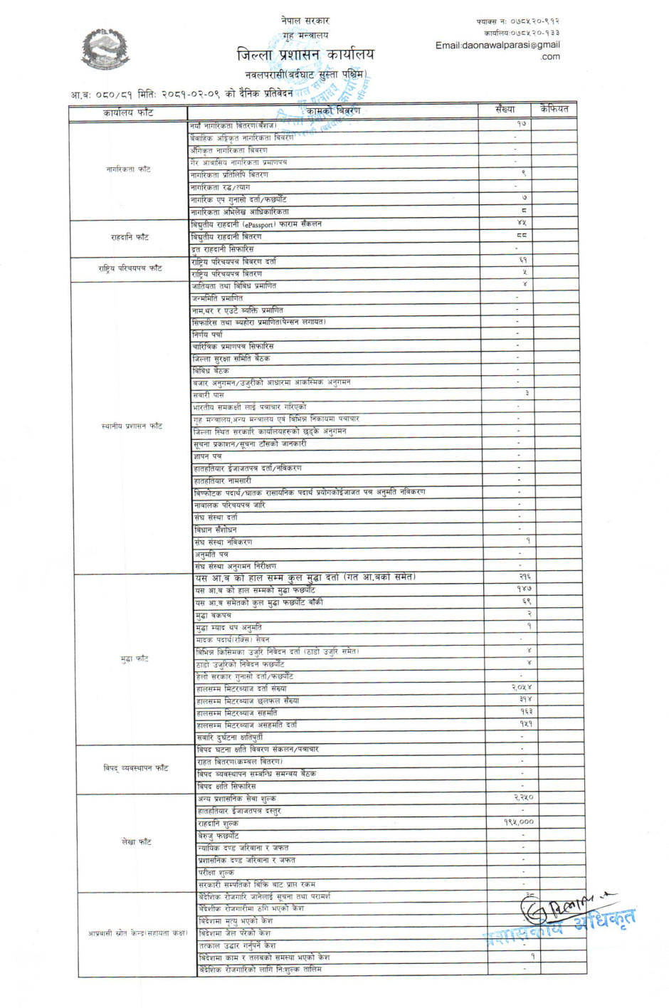 तस्बिर : मिति २०८१।०२।०९ गतेका दिन सम्पादित गरिएका कार्यको संख्यात्मक विवरण
