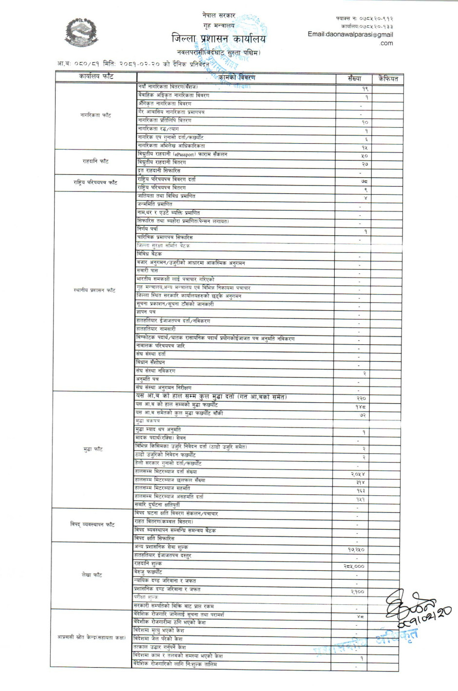 तस्बिर : मिति २०८१।०२।२० गतेका दिन सम्पादित गरिएका कार्यको संख्यात्मक विवरण