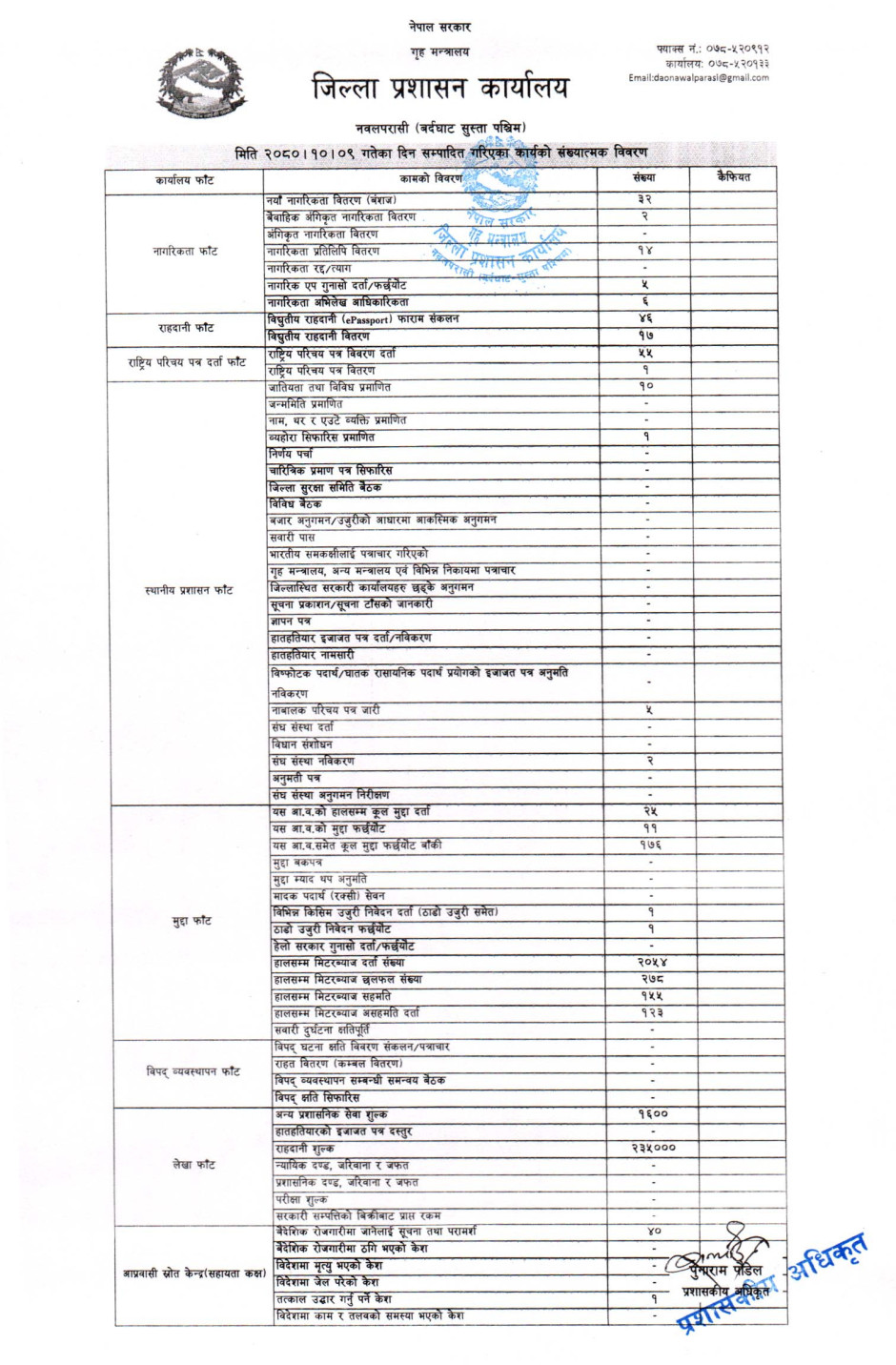 तस्बिर : मिति २०८०।१०।०९ गतेका दिन सम्पादित गरिएका कार्यको संख्यात्मक विवरण