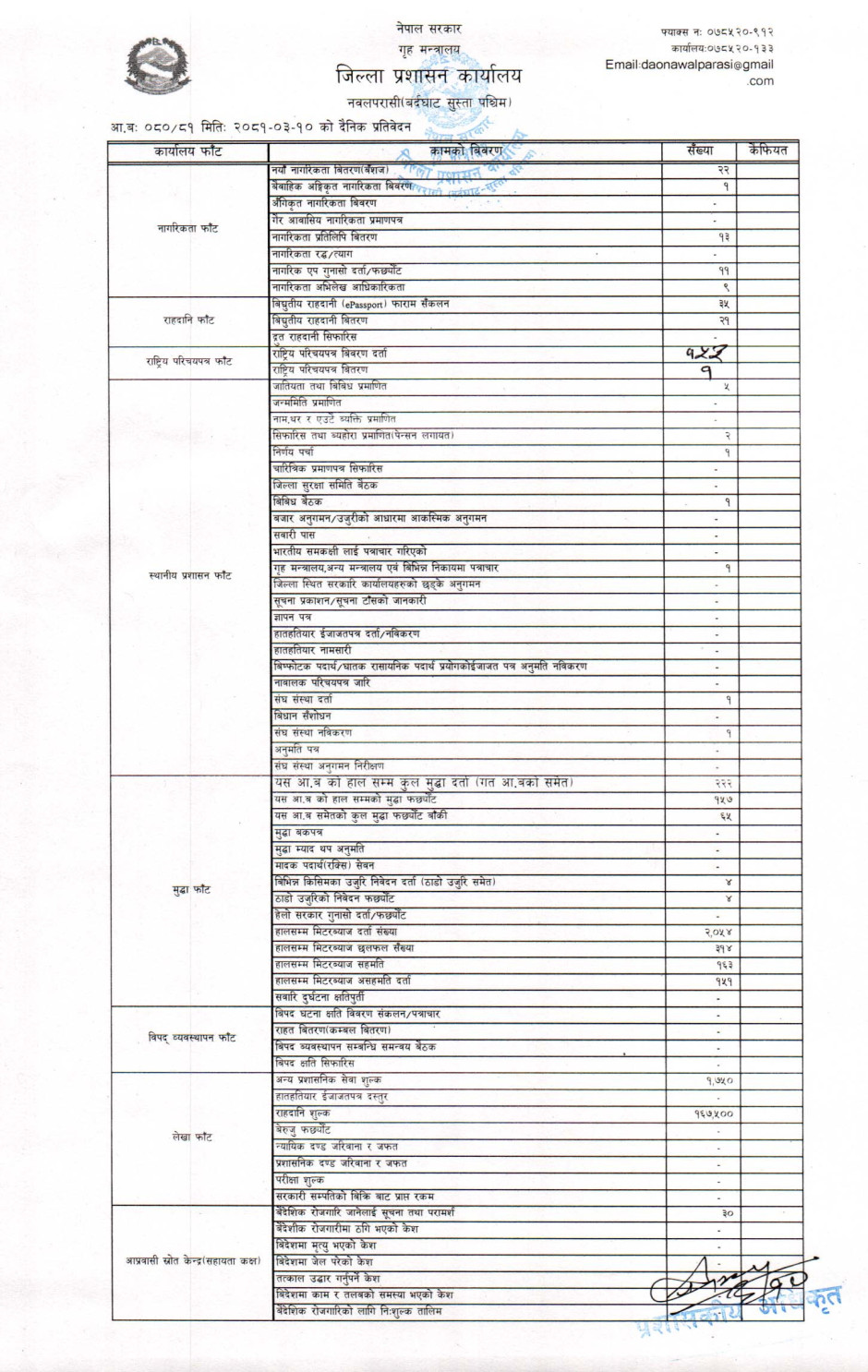 तस्बिर : मिति २०८१।०३।१० गतेका दिन सम्पादित गरिएका कार्यको संख्यात्मक विवरण