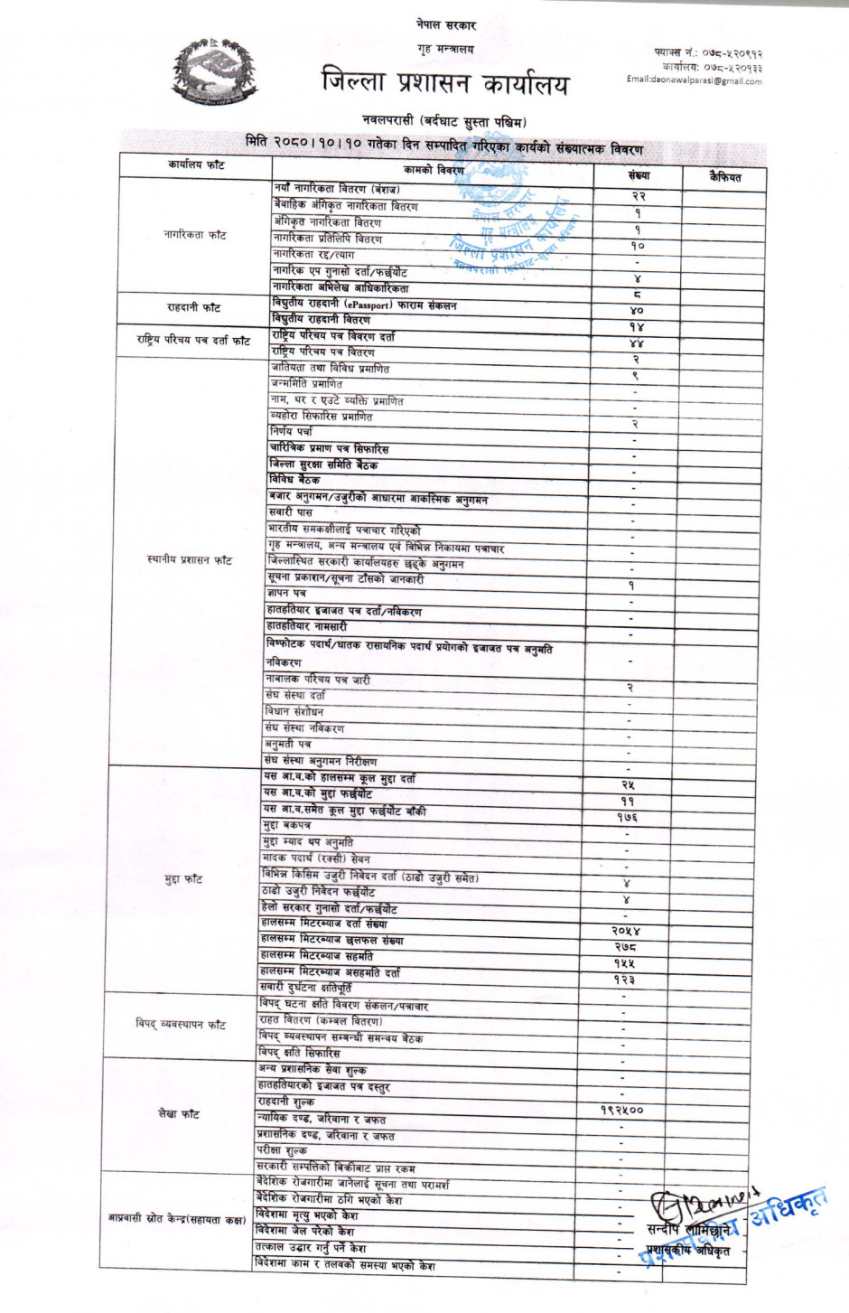 तस्बिर : मिति २०८०।१०।१० गतेका दिन सम्पादित गरिएका कार्यको संख्यात्मक विवरण
