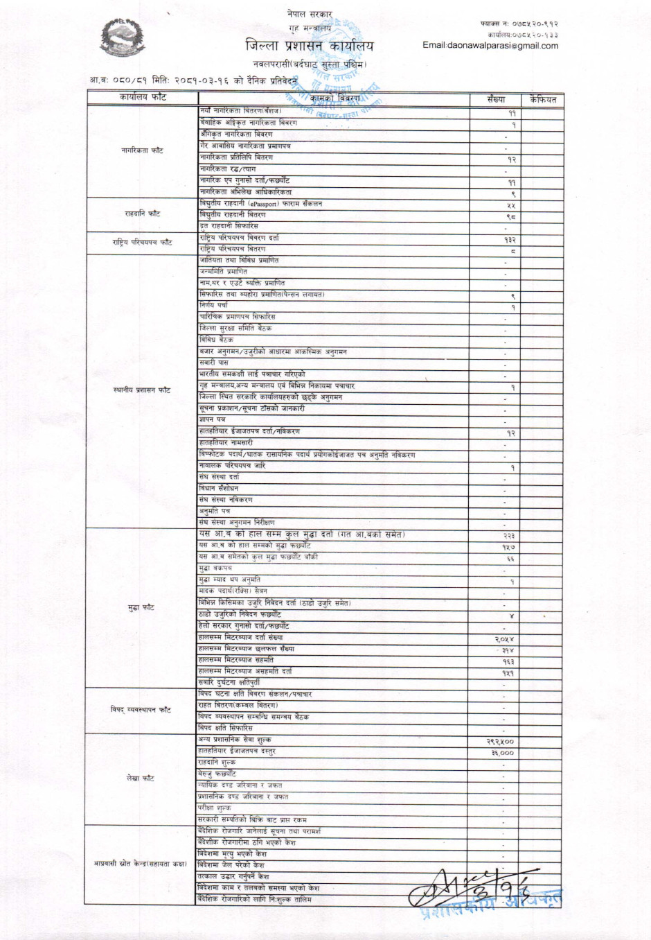 तस्बिर : मिति २०८१।०३।१६ गतेका दिन सम्पादित गरिएका कार्यको संख्यात्मक विवरण