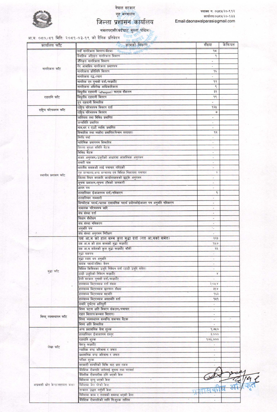 तस्बिर : मिति २०८१।०३।१९ गतेका दिन सम्पादित गरिएका कार्यको संख्यात्मक विवरण