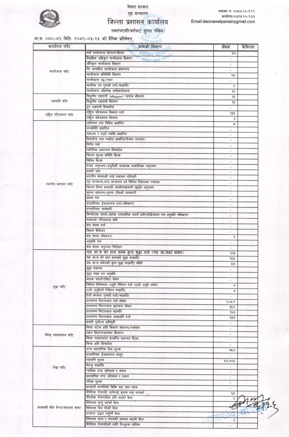 तस्बिर : मिति २०८१।०३।२६ गतेका दिन सम्पादित गरिएका कार्यको संख्यात्मक विवरण