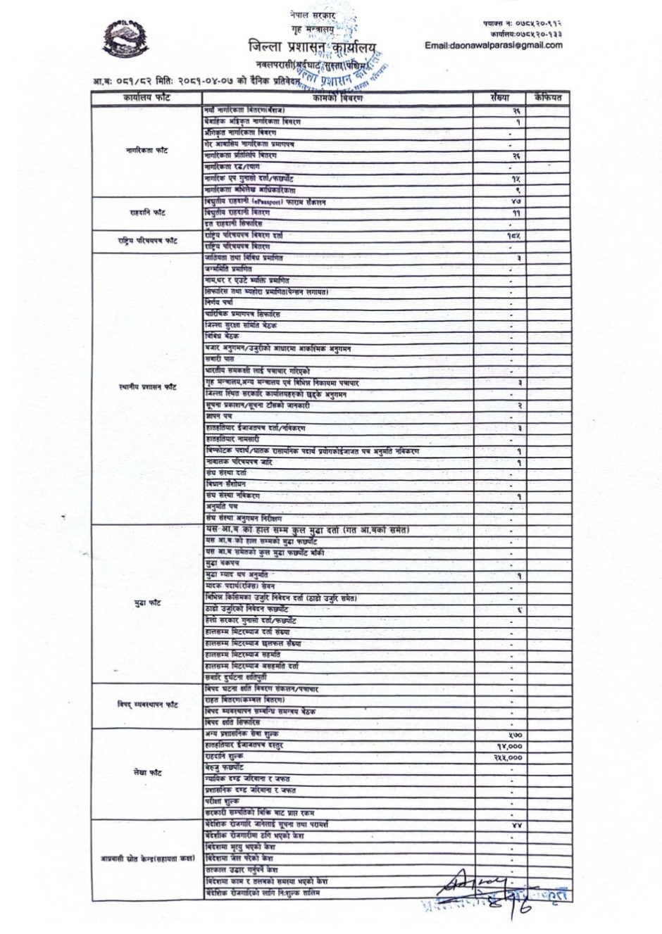 तस्बिर : मिति २०८१।०४।०७ गतेका दिन सम्पादित गरिएका कार्यको संख्यात्मक विवरण