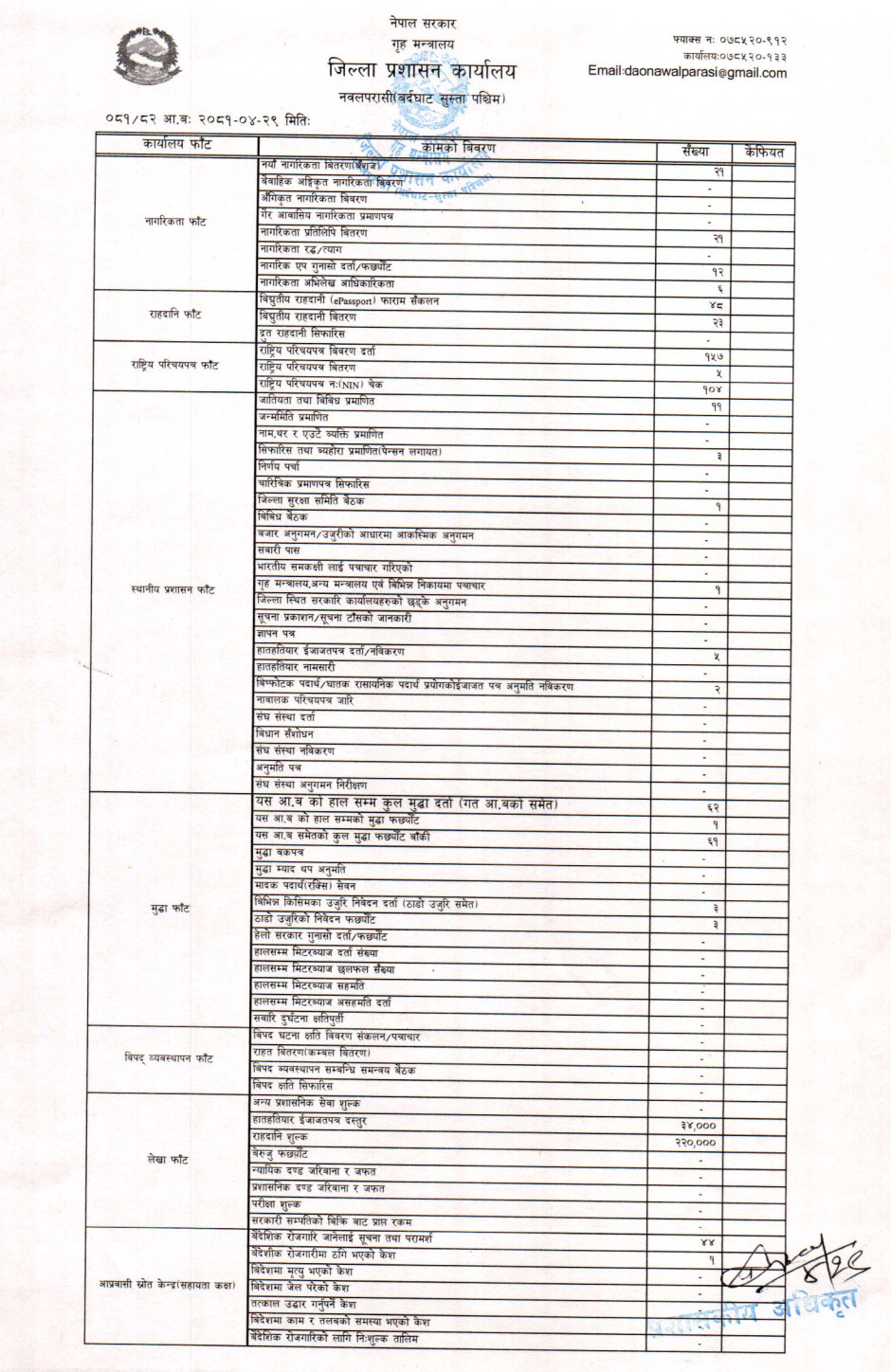 तस्बिर : मिति २०८१।०४।२९ गतेका दिन सम्पादित गरिएका कार्यको संख्यात्मक विवरण