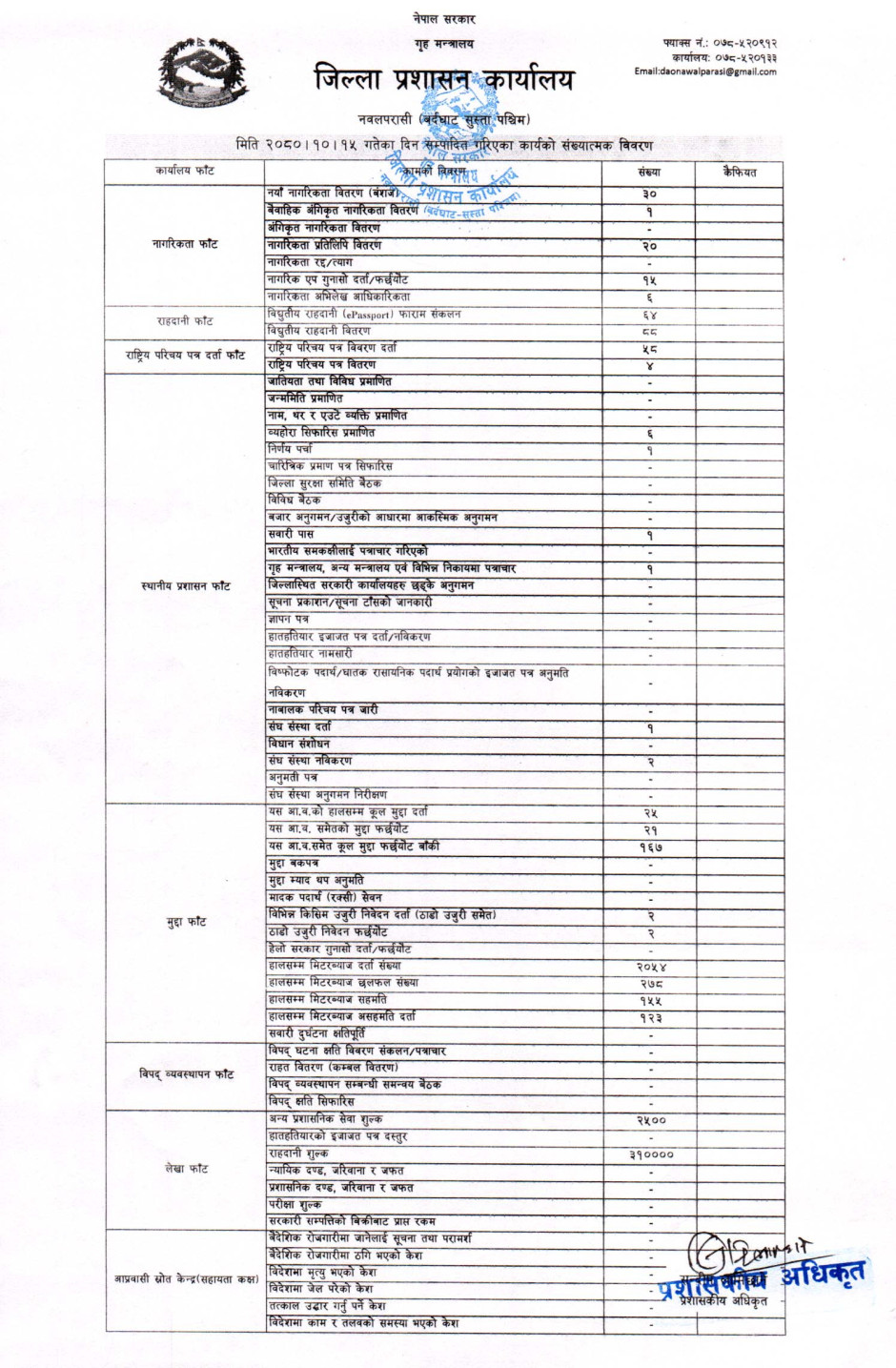तस्बिर : मिति २०८०।१०।१५ गतेका दिन सम्पादित गरिएका कार्यको संख्यात्मक विवरण