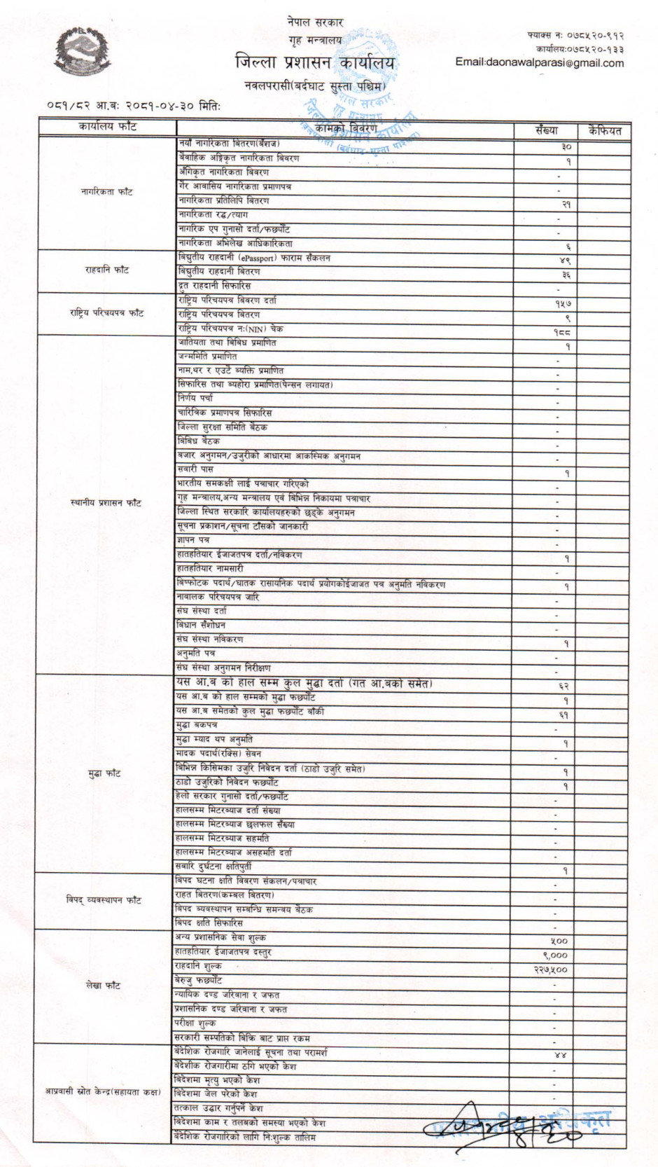 तस्बिर : मिति २०८१।०४।३० गतेका दिन सम्पादित गरिएका कार्यको संख्यात्मक विवरण