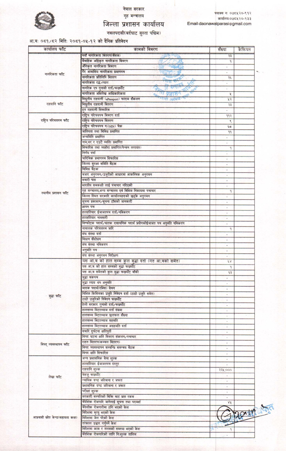 तस्बिर : मिति २०८१।०५।१२ गतेका दिन सम्पादित गरिएका कार्यको संख्यात्मक विवरण
