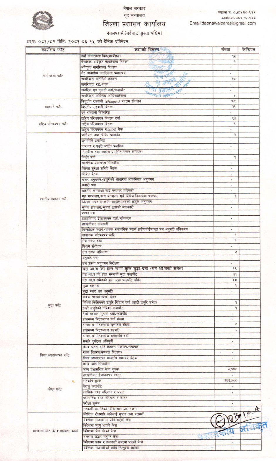 तस्बिर : मिति २०८१।०६।१५ गतेका दिन सम्पादित गरिएका कार्यको संख्यात्मक विवरण