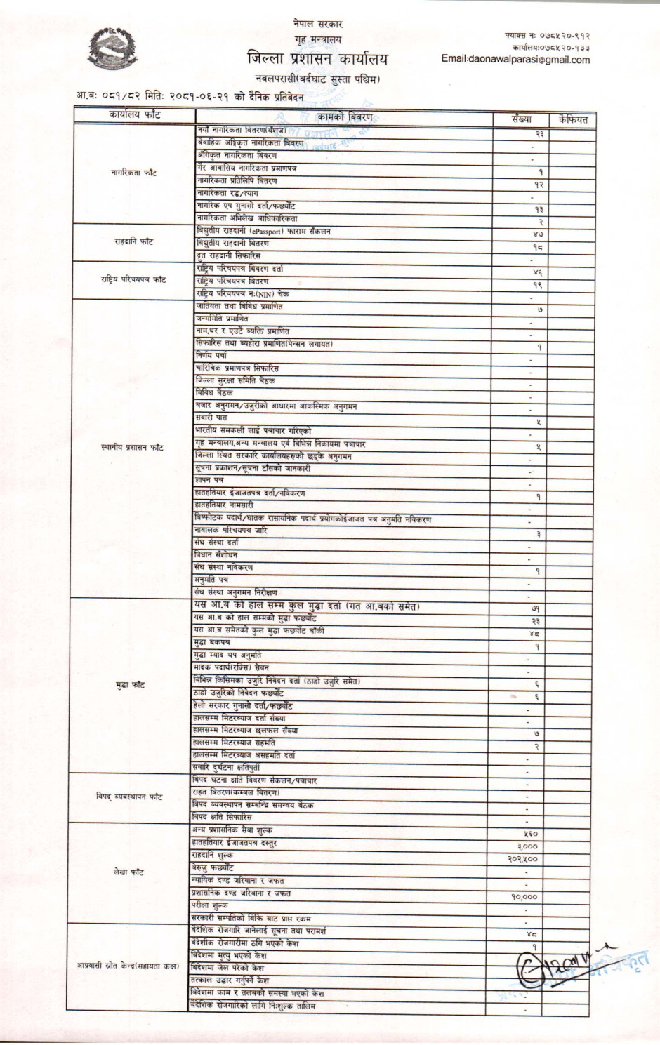 तस्बिर : मिति २०८१।०६।२१ गतेका दिन सम्पादित गरिएका कार्यको संख्यात्मक विवरण