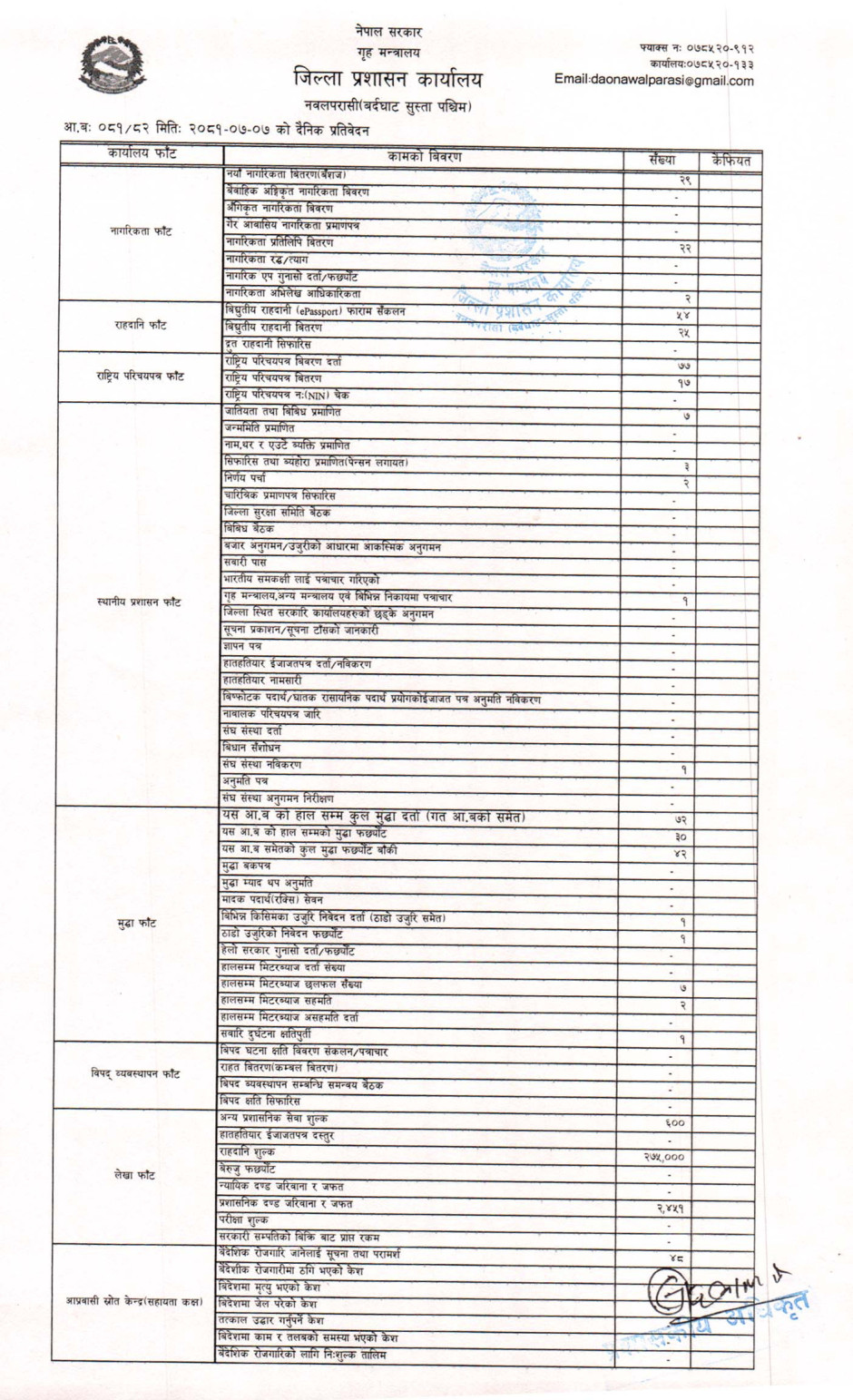 तस्बिर : मिति २०८१।०७।०७ गतेका दिन सम्पादित गरिएका कार्यको संख्यात्मक विवरण