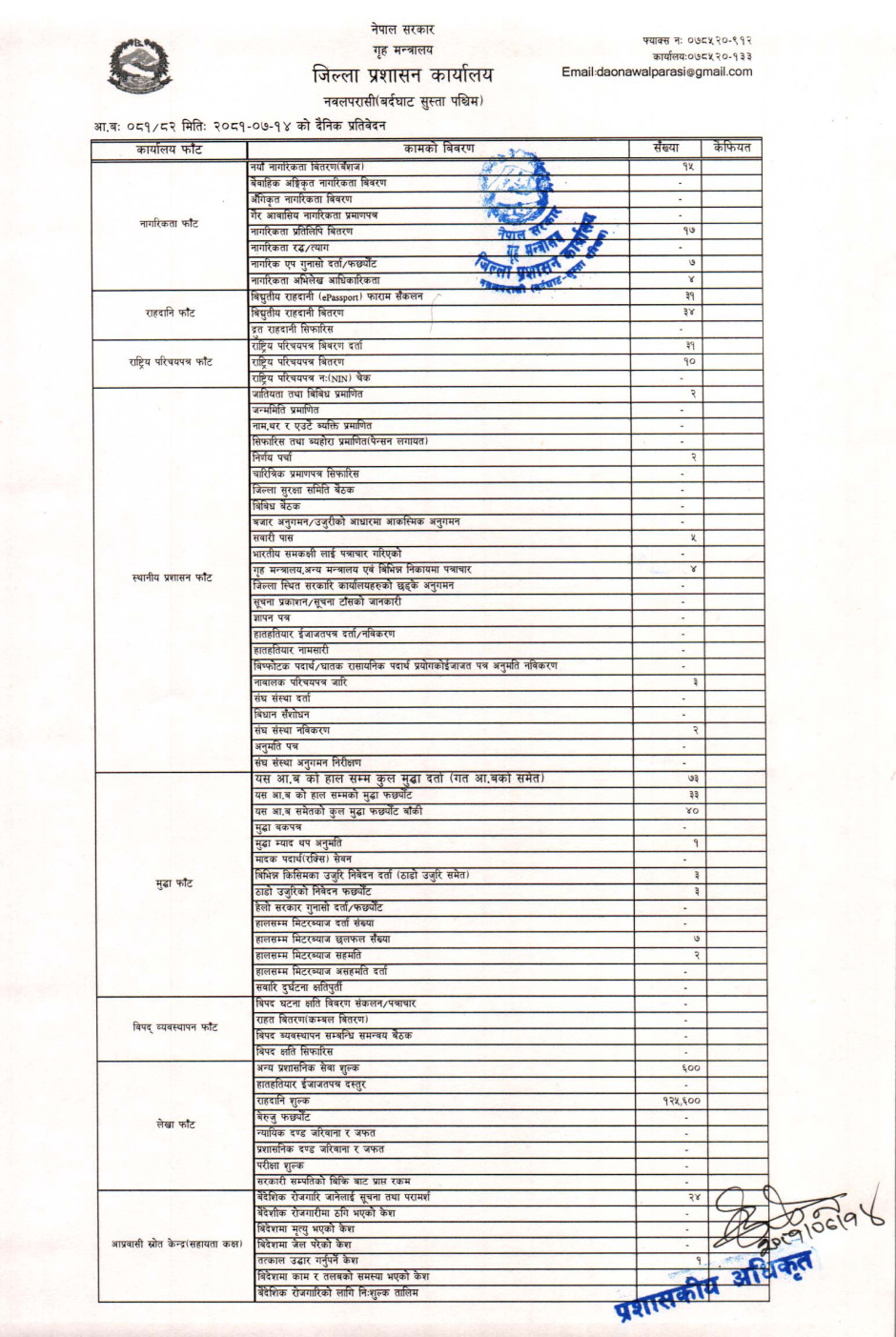 तस्बिर : मिति २०८१।०७।१४ गतेका दिन सम्पादित गरिएका कार्यको संख्यात्मक विवरण