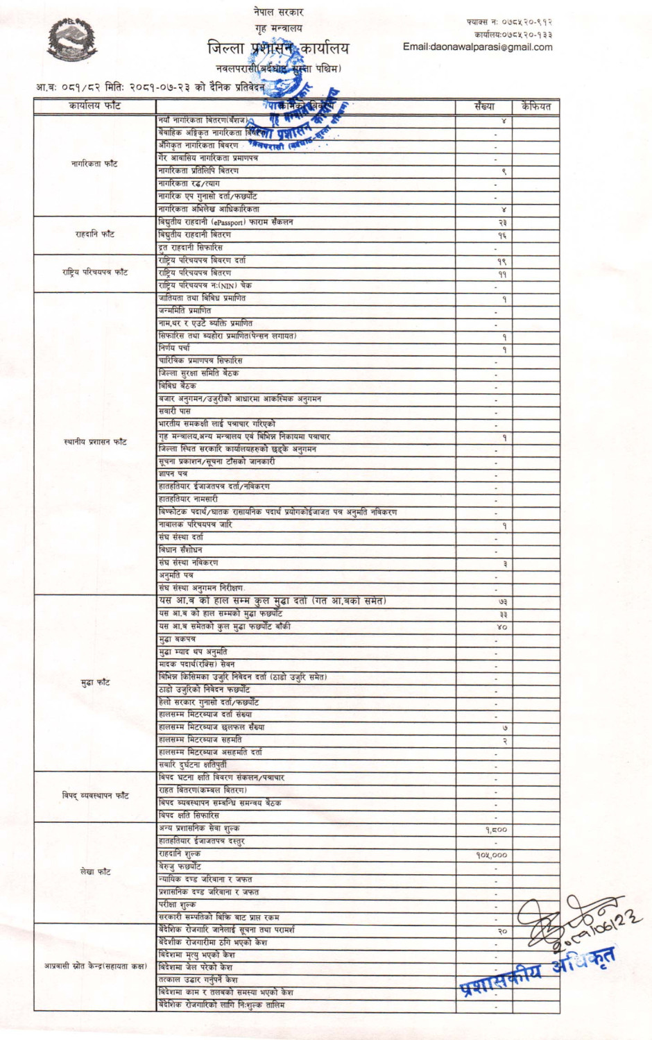 तस्बिर : मिति २०८१।०७।२३ गतेका दिन सम्पादित गरिएका कार्यको संख्यात्मक विवरण