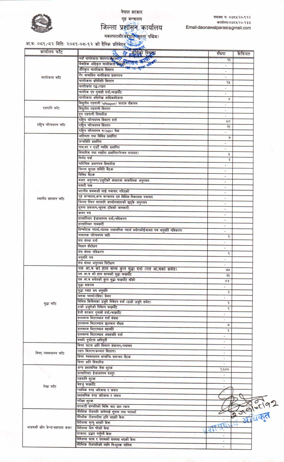 तस्बिर : मिति २०८१।०८।१२ गतेका दिन सम्पादित गरिएका कार्यको संख्यात्मक विवरण