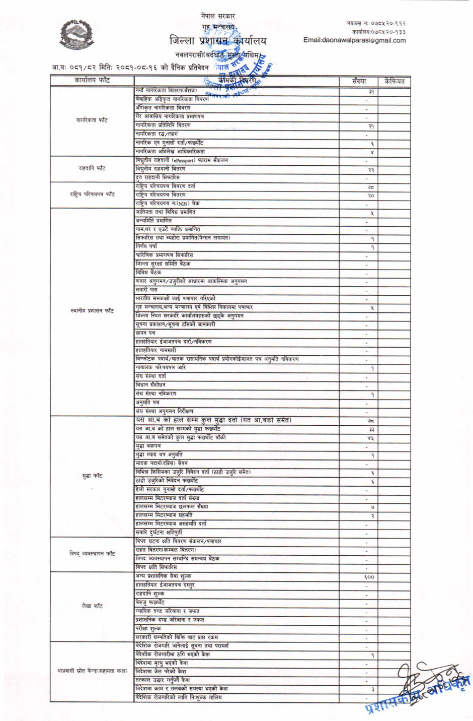 तस्बिर : मिति २०८१।०८।१६ गतेका दिन सम्पादित गरिएका कार्यको संख्यात्मक विवरण