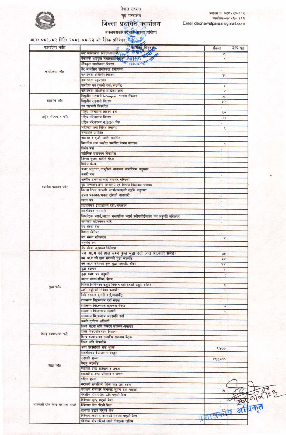 तस्बिर : मिति २०८१।०८।२३ गतेका दिन सम्पादित गरिएका कार्यको संख्यात्मक विवरण