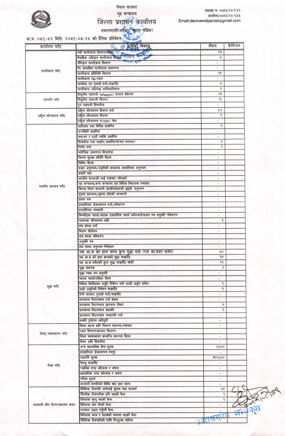 तस्बिर : मिति २०८१।०८।२६ गतेका दिन सम्पादित गरिएका कार्यको संख्यात्मक विवरण