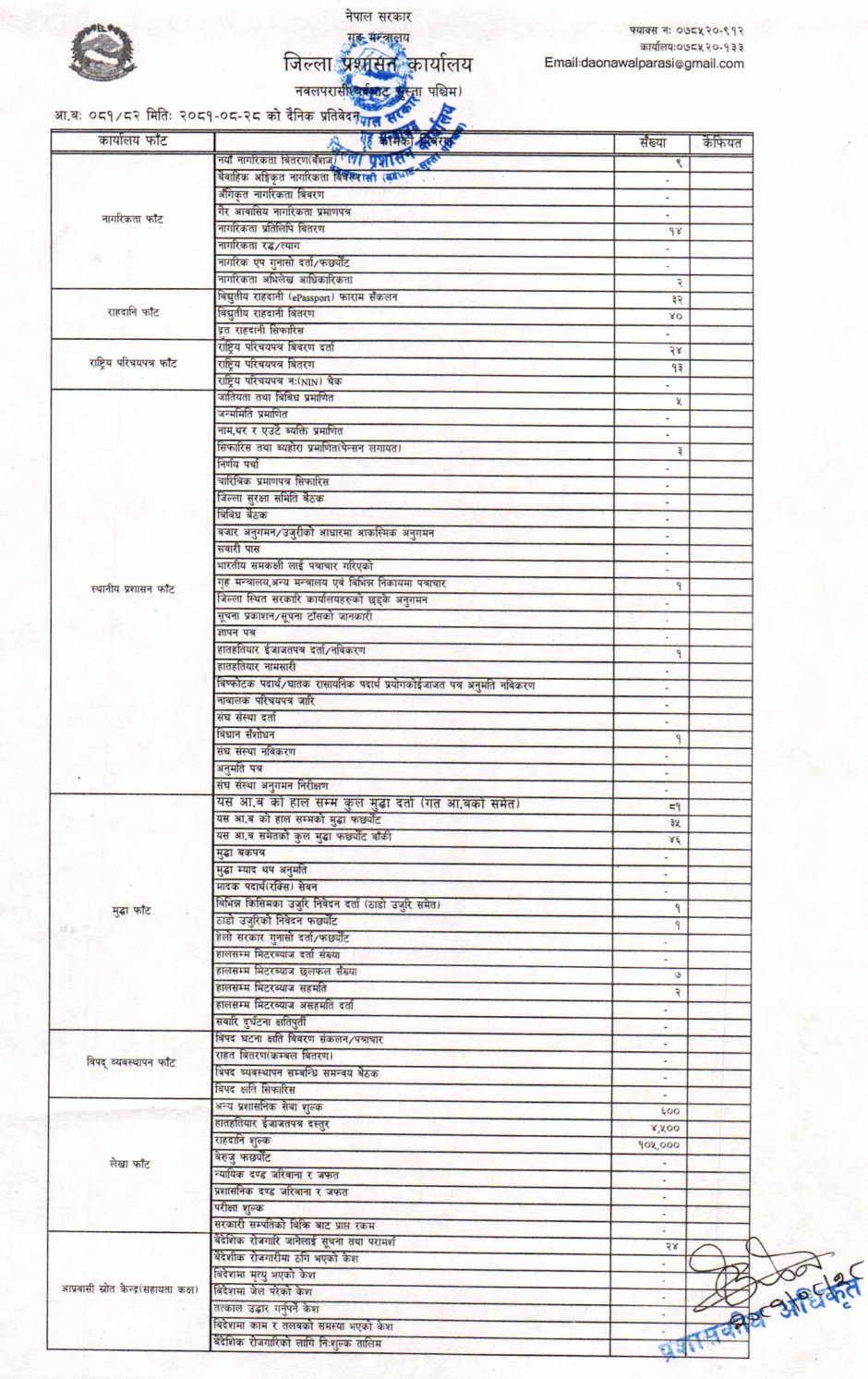 तस्बिर : मिति २०८१।०८।२८ गतेका दिन सम्पादित गरिएका कार्यको संख्यात्मक विवरण