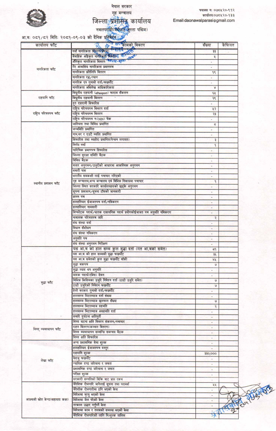 तस्बिर : मिति २०८१।०९।०३ गतेका दिन सम्पादित गरिएका कार्यको संख्यात्मक विवरण