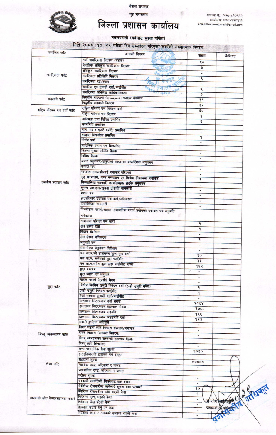 तस्बिर : मिति २०८०।१०।२९ गतेका दिन सम्पादित गरिएका कार्यको संख्यात्मक विवरण