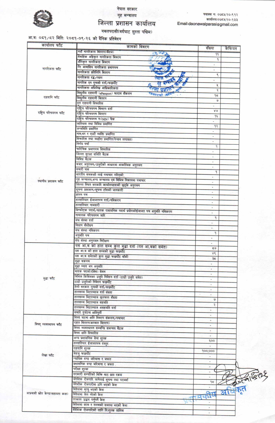 तस्बिर : मिति २०८१।०९।२६ गतेका दिन सम्पादित गरिएका कार्यको संख्यात्मक विवरण