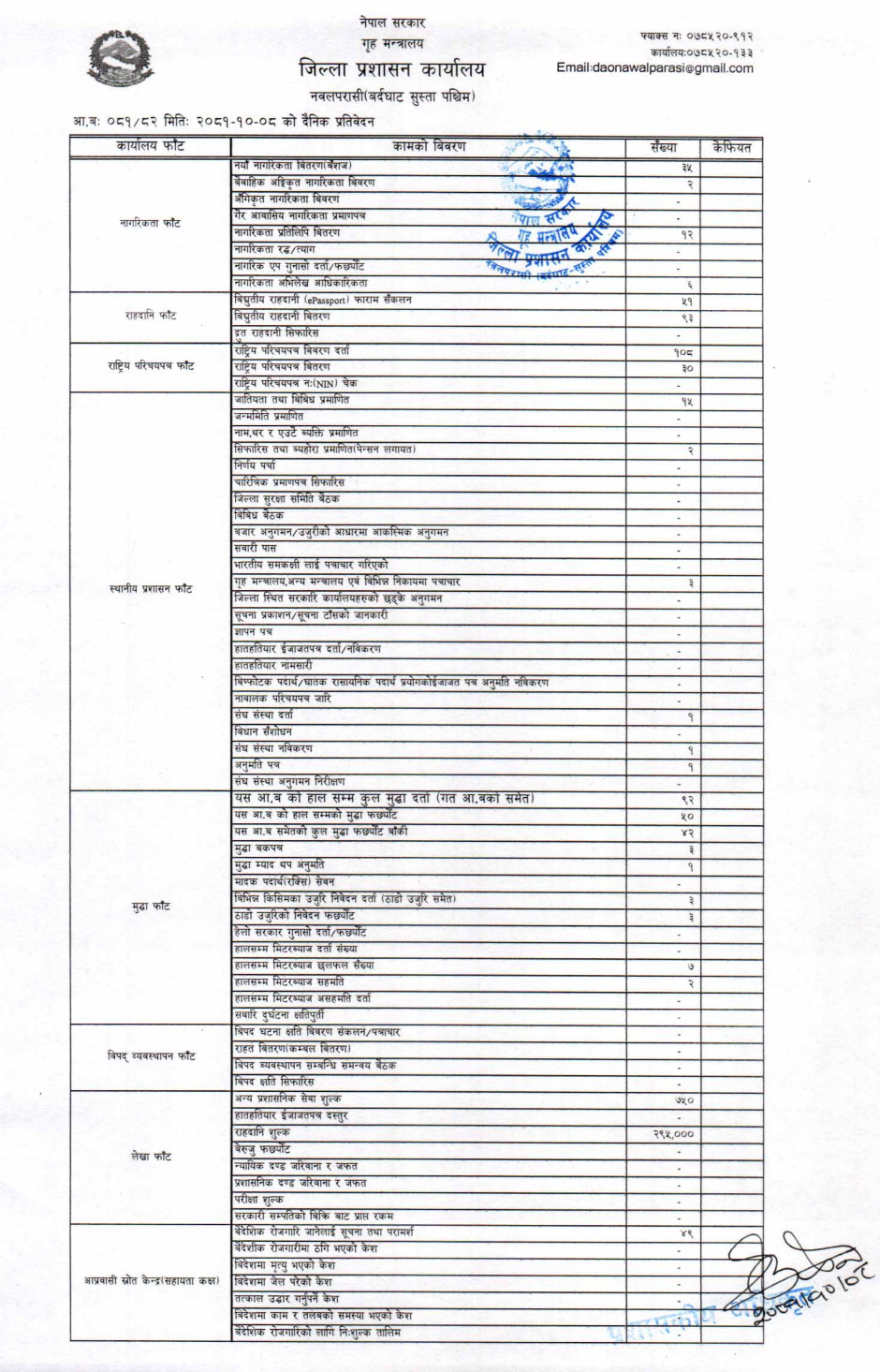 तस्बिर : मिति २०८१।१०।०८ गतेका दिन सम्पादित गरिएका कार्यको संख्यात्मक विवरण