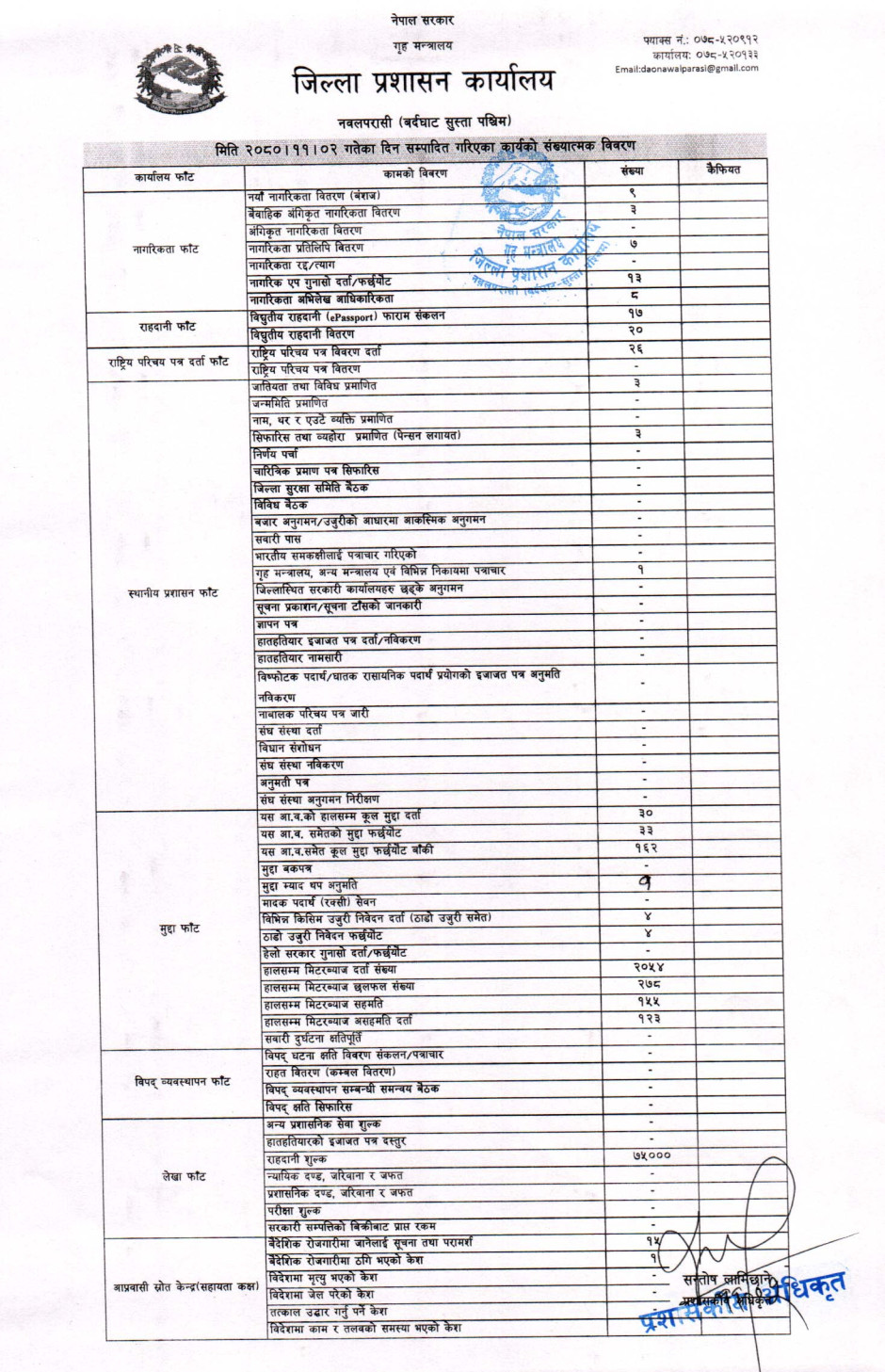 तस्बिर : मिति २०८०।११।०२ गतेका दिन सम्पादित गरिएका कार्यको संख्यात्मक विवरण