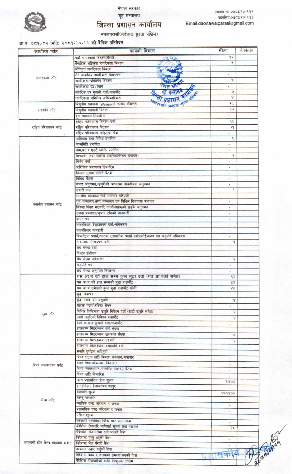 तस्बिर : मिति २०८१।१०।११ गतेका दिन सम्पादित गरिएका कार्यको संख्यात्मक विवरण