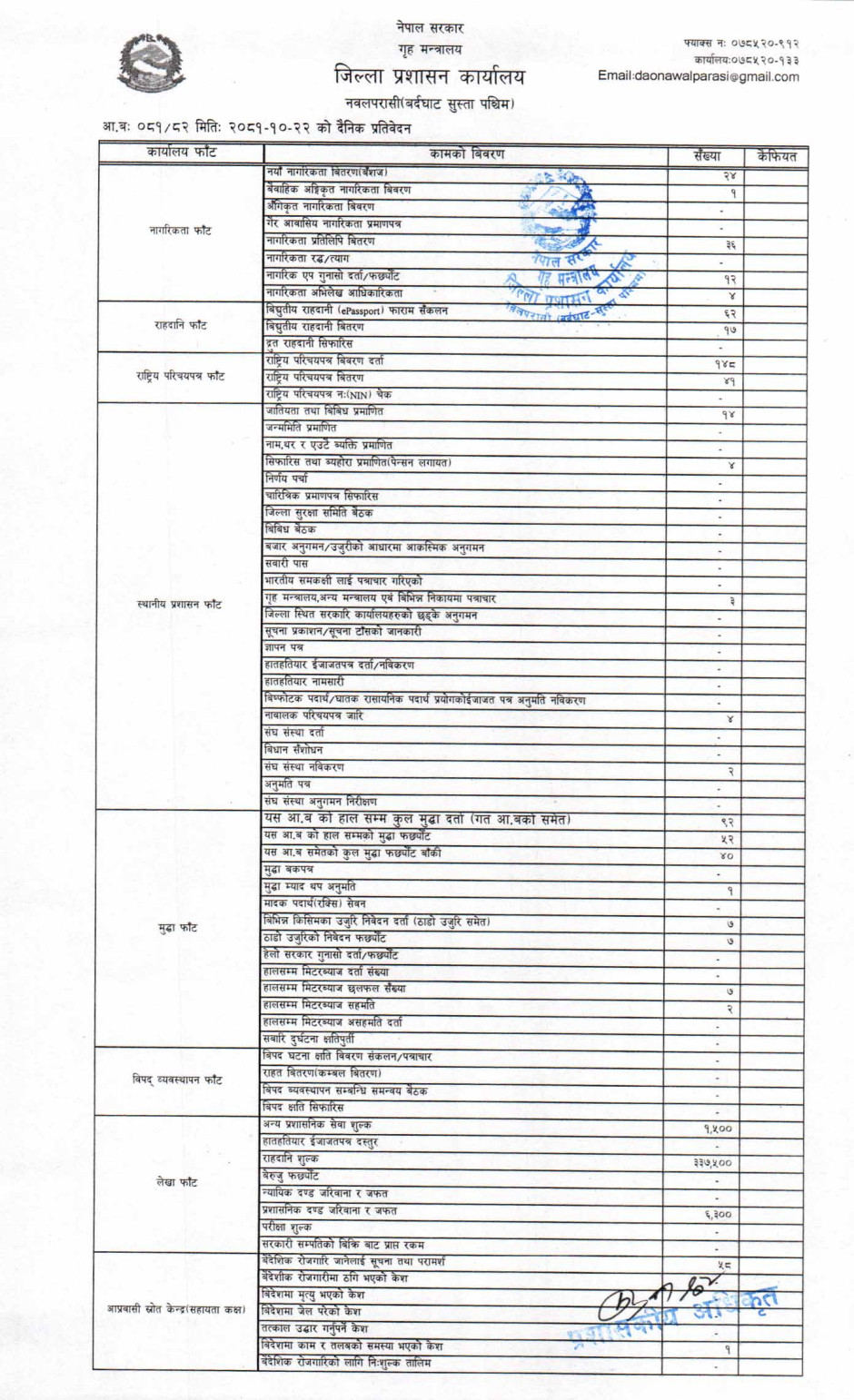 तस्बिर : मिति २०८१।१०।२२ गतेका दिन सम्पादित गरिएका कार्यको संख्यात्मक विवरण