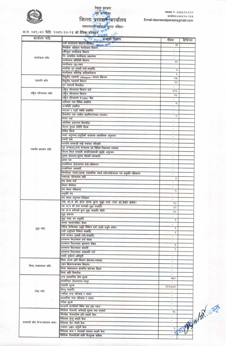 तस्बिर : मिति २०८१।१०।२३ गतेका दिन सम्पादित गरिएका कार्यको संख्यात्मक विवरण