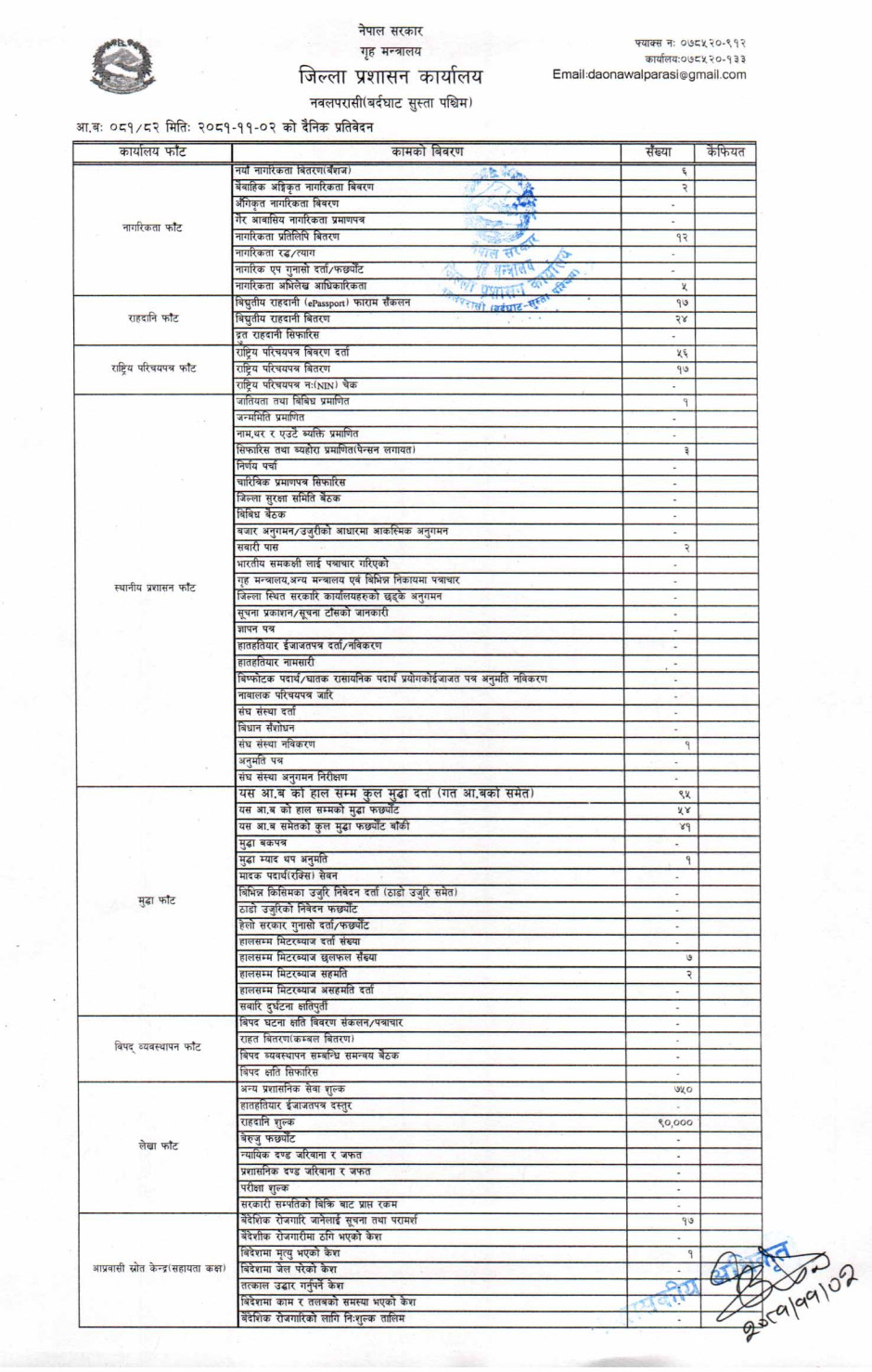 तस्बिर : मिति २०८१।११।०२ गतेका दिन सम्पादित गरिएका कार्यको संख्यात्मक विवरण