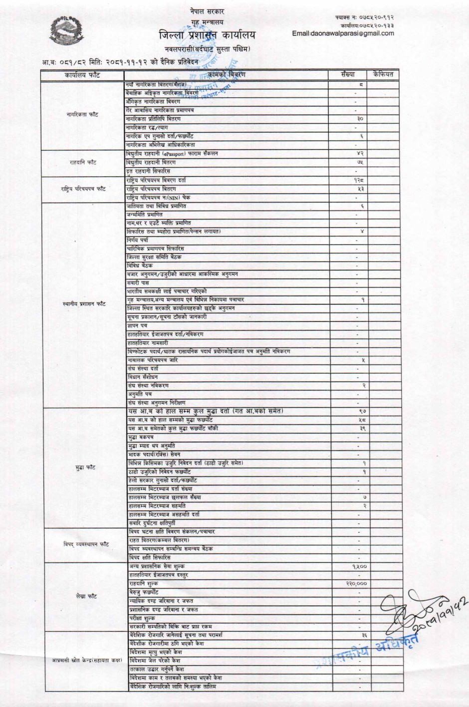 तस्बिर : मिति २०८१।११।१२ गतेका दिन सम्पादित गरिएका कार्यको संख्यात्मक विवरण