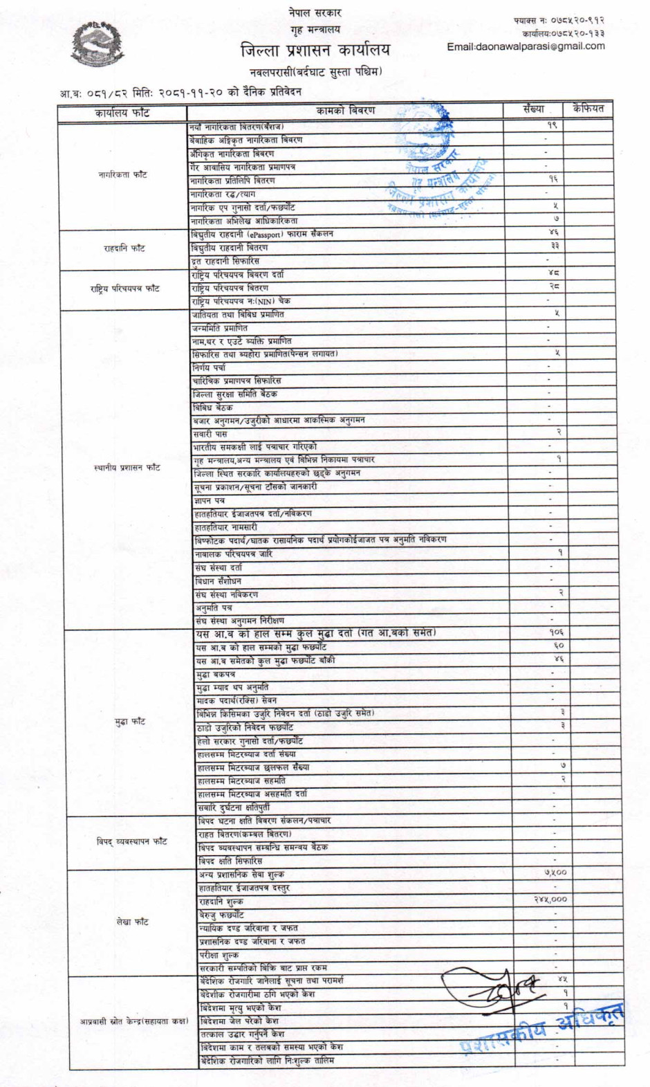 तस्बिर : मिति २०८१।११।२० गतेका दिन सम्पादित गरिएका कार्यको संख्यात्मक विवरण