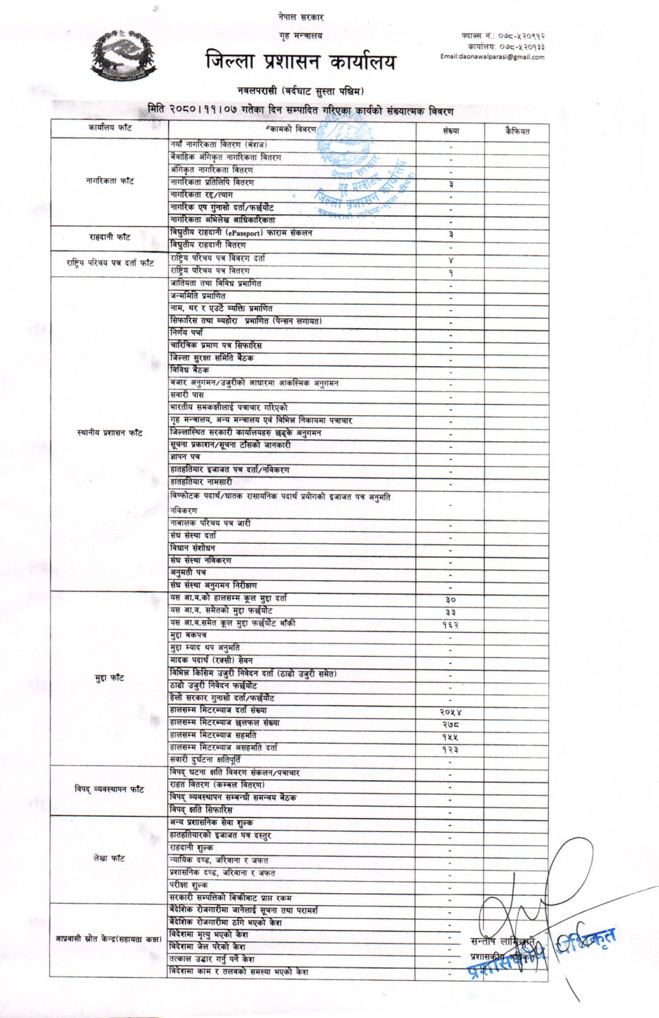 तस्बिर : मिति २०८०।११।०७ गतेका दिन सम्पादित गरिएका कार्यको संख्यात्मक विवरण